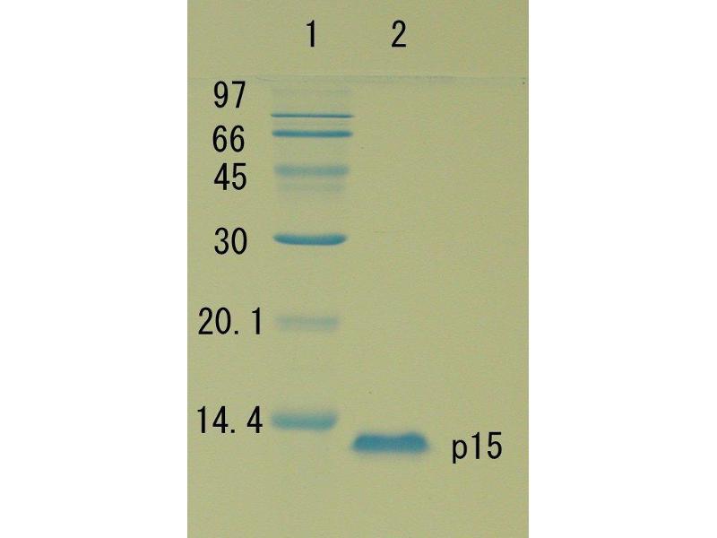 HIV-1 Gag p15 is processed by digestion of its precursor Gag p55 by HIV-1 protease. This protein is further digested into nuclocapsid protein p7 and into p6 and p1 of unknown function. This digestion is promoted by binding of HIV-1 genome RNA and the two Zn finger motifs that exist in the p7 region. The produced nucleocapsid protein p7 regulates the RNA function by directly binding to HIV-1 genome RNA. HIV-1 Gag p15 was over-expressed as a recombinant protein in E. coli with a plasmid carrying the Gag p15 coding region of HIV-1 virus, subtype B, and highly purified by several steps of chromatography. Its molecular size is 15 kD, same as that of p15 purified from AIDS virus particles.