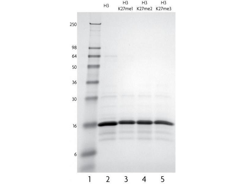 - Recombinant Xenopus laevis Histone H3 dimethyl Lys27 (H3K27me2) is produced in E. coli and purified using FPLC. The protein contains a substitution of cysteine to alanine at amino acid 110. Recombinant methylated histones are specifically methylated via a chemical alkylation reaction that introduces a methyl lysine analog (MLA). This specific chemical treatment enables the site and degree of methylation to be controlled precisely. Each methylation reaction is over 99 % complete, as verified by high-resolution ESI-TOF mass spectrometry. Protein concentration was determined using the molar extinction coefficient for Histone H3 and absorbance at 280nm. The recombinant histone is >98 % pure by SDS-PAGE. The molecular weight of the recombinant histone is 15,285 Daltons.