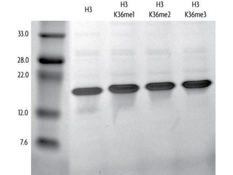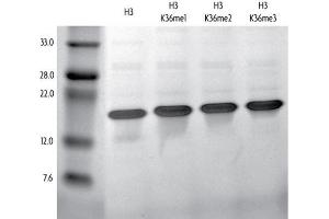 - Recombinant Xenopus laevis Histone H3 trmethyl Lys36 (H3K36me3) is produced in E. coli and purified using FPLC. The protein contains a substitution of cysteine to alanine at amino acid 110. Recombinant methylated histones are specifically methylated via a chemical alkylation reaction that introduces a methyl lysine analog (MLA). This specific chemical treatment enables the site and degree of methylation to be controlled precisely. Each methylation reaction is over 99 % complete, as verified by high-resolution ESI-TOF mass spectrometry. Protein concentration was determined using the molar extinction coefficient for Histone H3 and absorbance at 280nm. The recombinant histone is >98 % pure by SDS-PAGE. The molecular weight of the recombinant histone is 15,300 Daltons.