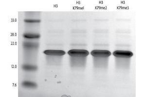 - Recombinant Xenopus laevis Histone H3 monomethyl Lys79 (H3K79me1) is produced in E. coli and purified using FPLC. The protein contains a substitution of cysteine to alanine at amino acid 110. Recombinant methylated histones are specifically methylated via a chemical alkylation reaction that introduces a methyl lysine analog (MLA). This specific chemical treatment enables the site and degree of methylation to be controlled precisely. Each methylation reaction is over 99 % complete, as verified by high-resolution ESI-TOF mass spectrometry. Protein concentration was determined using the molar extinction coefficient for Histone H3 and absorbance at 280nm. The recombinant histone is >98 % pure by SDS-PAGE. The molecular weight of the recombinant histone is 15,271 Daltons.