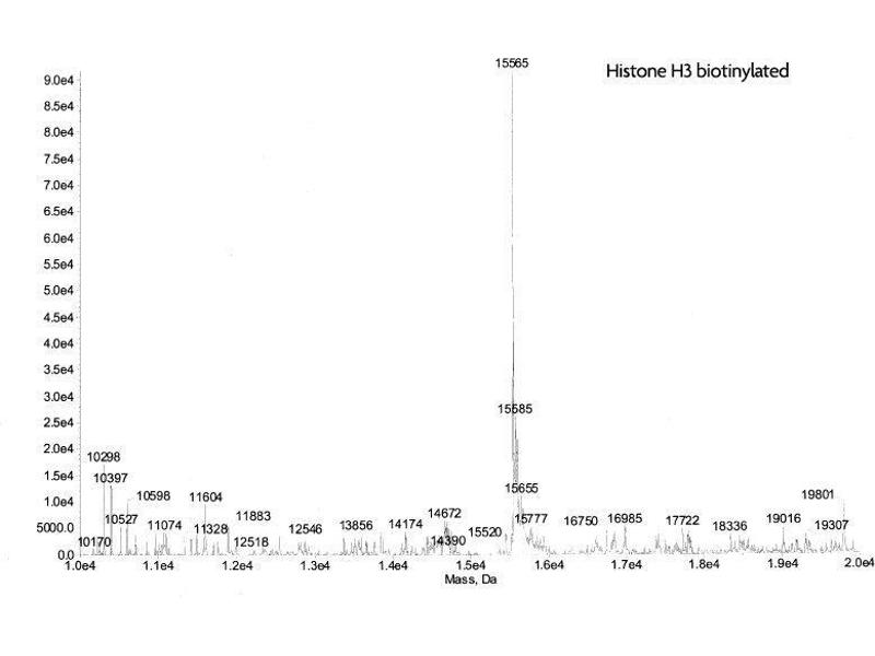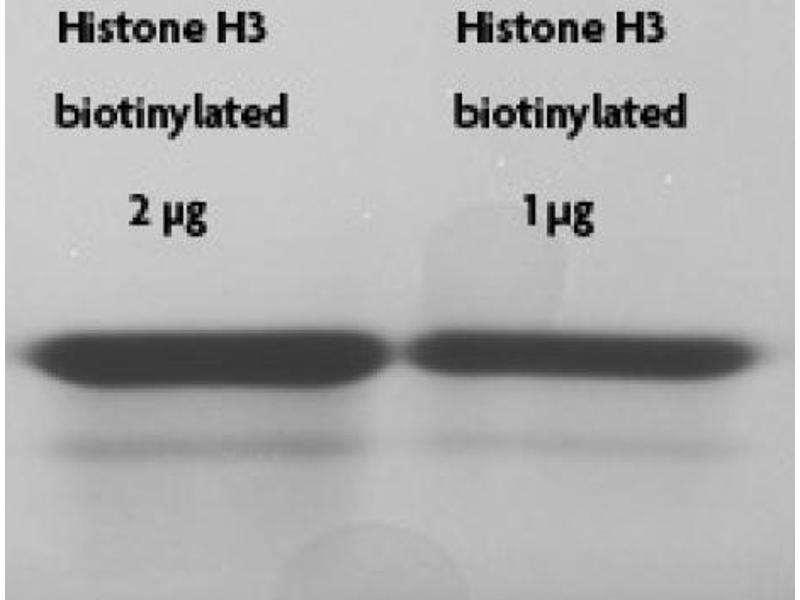 - Truncated human Histone H3.2 is produced in E. coli and purified using FPLC. The purified protein is subsequently ligated to a peptide containing the histone tail with a N-terminal biotin via a native peptide bond. The full-length protein is then repurified prior to lyophilization. Protein concentration was determined using the molar extinction coefficient for Histone H3 and absorbance at 280nm. Protein was determined to have ≥ 98 % purity by SDS-PAGE. The molecular weight is 15,565 Daltons.