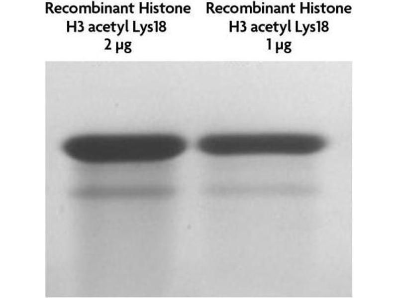 - Recombinant Histone H3 acetyl Lys18 (H3K18ac) proteins are generated using expressed protein ligation (EPL) technology. Truncated human Histone H3.2 is produced in E. coli and purified using FPLC. The purified protein is subsequently ligated to a N-terminal histone tail peptide containing acetylated lysine 18 via a native peptide bond. The full-length protein is then repurified prior to lyophilization. Protein concentration was determined using the molar extinction coefficient for Histone H3 and absorbance at 280nm. The recombinant histone is >98 % pure by SDS-PAGE and confirmed by high-resolution ESI-TOF mass spectrometry. The molecular weight of the recombinant histone is 15,270 Daltons.