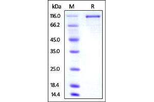 - This protein carries a mouse IgG1 Fc tag at the N-terminus, and has a calculated MW of 103.2 kDa. The predicted N-terminus is Ile. The reducing (R) protein migrates as 116 kDa in SDS-PAGE due to glycosylation.