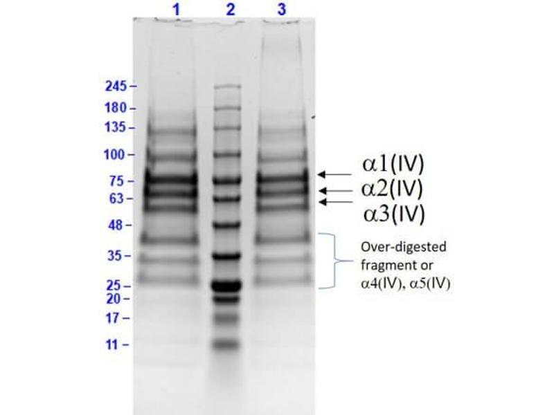 Application Note: Collagen type IV has been tested in SDS-Page and can be used as a control or standard in indirect trapping ELISA for quantitation of antigen using a standard curve, for immunoprecipitation and for other immunological assays as optimized by the user. Specific conditions should be optimized by user.