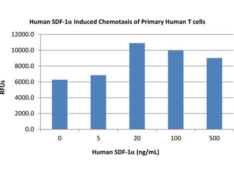 Background: Stromal cell Derived Factor-1 alpha (SDF-1α), also called CXCL12, is one of two splice variants made by a wide variety of cells when stimulated by inflammatory cytokines such as, TNF, IL-1 or LPS. SDF-1α signals through the G protein-couple receptor, CXCR4, to recruit activated leukocytes. Human and mouse SDF-1α share 99 % sequence identity. Recombinant human SDF-1α is a non-glycosylated protein, containing 68 amino acids, with a molecular weight of 8 kDa.