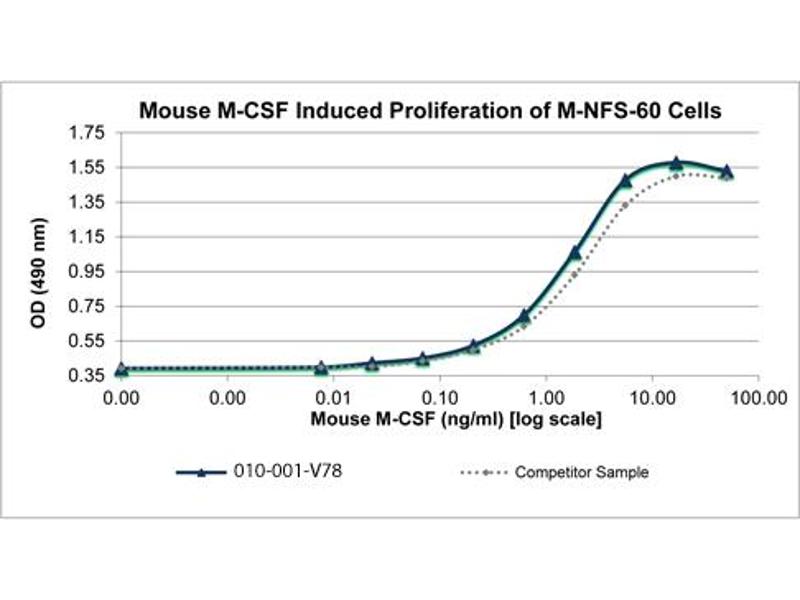 Background: Macrophage Colony Stimulating Factor (M-CSF) is hematopoietic growth factor produced by a wide variety of cells. M-CSF is known to stimulate differentiation of hematopoietic stem cells to monocyte-macrophage cell populations in culture. M-CSF acts through the CSF receptor 1. Although human M-CSF shows activity on mouse cells, mouse CSF shows no activity on human cells. Recombinant mouse M-CSF is a disulfide-linked homodimer, containing two 156 amino acid chains, with a total molecular weight of 36.8 kDa.