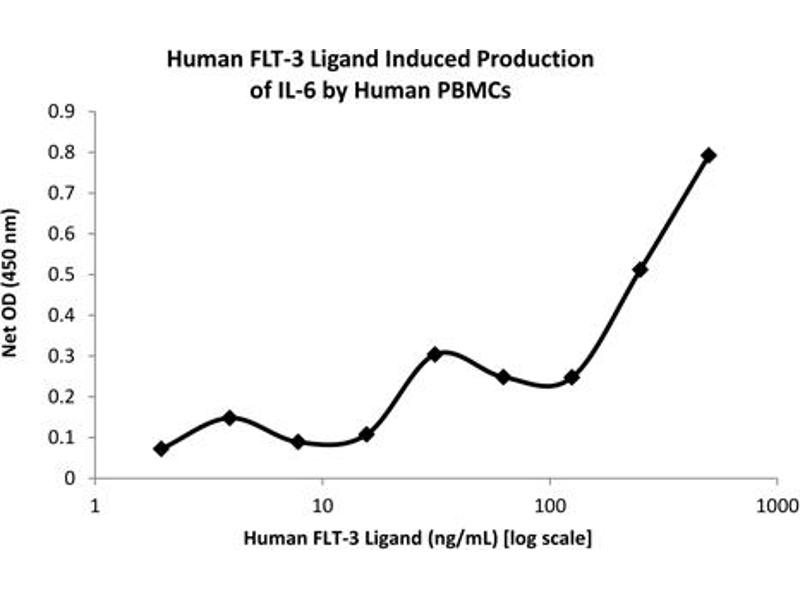 Background: FMS-related Tyrosine Kinase 3 Ligand (FLT-3 Ligand) is a growth factor important for the proliferation of hematopoietic cells. FLT-3 Ligand binds to, and transmits signals through, the receptor tyrosine kinase known as FMS-like Tyrosine Kinase-3 (FLT-3). FLT-3 Ligand promotes long-term expansion and differentiation of human pro-B cells in the presence of IL-7 or in combination of IL-7 and IL-3. Human FLT-3 Ligand can stimulate the proliferation of cells expressing murine FLT-3 receptors. Recombinant human FLT-3 Ligand is a non-glycosylated protein, containing 155 amino acids, with a molecular weight of 17.7 kDa.