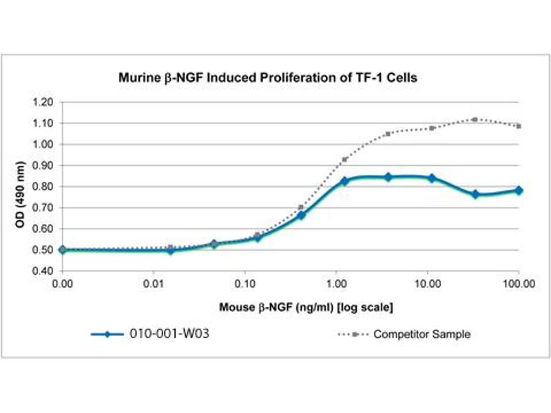 Background: Nerve Growth Factor (NGF-β) is a neurotrophic factor related to BDNF, NT-3 and NT-4. NGF-β acts through its receptor β-NGFR, and is involved in the development and maintenance of the sensory and sympathetic nervous systems. NGF-β also is also involved in the growth, differentiation and survival of B lymphocytes. Human, mouse and rat proteins show cross-reactivity. Recombinant mouse NGF-β is a non-glycosylated, non-covalently linked homodimer, containing two 120 amino acid chains , with a molecular weight of 13.5 kDa each.
