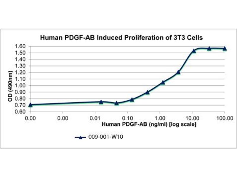 Background: Platelet-Derived Growth Factor (PDGF) is a mitogenic peptide growth hormone carried in the alpha-granules of platelets and is released when platelets adhere to traumatized tissues. Connective tissue cells near the traumatized region respond by initiating the process of replication. The synthesis of PDGF can be induced by IL-1, IL-6, TNF-α, TGF-β and EGF. Recombinant human PDGF-AB is a non-glycosylated, disulfide-linked heterodimer, containing one 14.3 kDa alpha-chain and one 12.1 kDa beta-chain, with total molecular weight of 26.4 kDa.