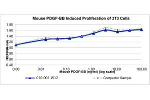 Background: Platelet-Derived Growth Factor (PDGF) is a mitogenic peptide growth hormone carried in the alpha-granules of platelets and is released when platelets adhere to traumatized tissues. Connective tissue cells near the traumatized region respond by initiating the process of replication. The synthesis of PDGF can be induced by IL-1, IL-6, TNF-α, TGF-β and EGF. Recombinant mouse PDGF-BB is a non-glycosylated, disulfide-linked homodimer, containing two 109 amino acids chains, with a total molecular weight of 24.6 kDa.