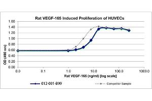 Background: Vascular Endothelial Growth Factor-A (VEGF-A) was originally isolated from tumor cells and is produced by a wide variety of cell types. In addition to stimulating vascular growth and vascular permeability, VEGF-A may play a role in stimulating vasodilatation via nitric oxide-dependent pathways. VEGF-A has several variants, VEGF-165 being the most abundant. Rat and bovine VEGF are one amino acid shorter than the human factor, and the bovine and human sequences show a homology of 95 % . Recombinant rat VEGF-165 is a disulfide linked homodimer, containing two 165 amino acids chains, with a total molecular weight of 38.8 kDa.