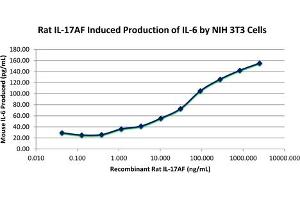 Background: Interleukin-17AF (IL-17AF) is a member of the IL-17 family of proteins produced by a subset of T cells, called Th17, following stimulation with IL-23. Since IL-17AF is thought to signal through the IL-17RA receptor, its biological function is similar to that of IL-17A in that it induces the production of a variety of chemokines, in addition to airway neutrophilia. In regard to these functions, IL-17AF has less activity than the IL-17A homodimer but, greater activity than the IL-17F homodimer. Human and rat IL-17AF both show activity on mouse cells. Recombinant rat IL-17AF is a non-glycosylated, disulfide-linked heterodimer, containing one IL-17A subunit and one IL-17F subunit. The dimer has a total of 269 amino acids, with total molecular weight of 30.7 kDa.