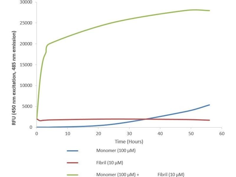 - 100 μM A53T alpha synuclein protein monomer (SPR-325) seeded with 10 nM A53T alpha synuclein protein PFF (SPR-326) in 25 μM Thioflavin T (PBS pH 7.4, 100 μl reaction volume) generated a fluorescence intensity of 28 000 Relative Fluorescence Units after incubation at 37°C with shaking at 600 rpm for 56 hours. Fluorescence was measured by excitation at 450 nm and emission at 485 nm on a Molecular Devices Gemini XPS microplate reader.
