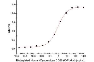 - Immobilized Anti-CD28 mAb(Cat#A063) at 2μg/ml (100 μl/well) can bind Human/Cynomolgus CD28-Fc-Avi(Cat#CY34). The ED50 of Human/Cynomolgus CD28-Fc-Avi(Cat#CY34) is 0.84 ng/ml.
