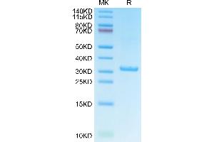 - 27.8 kDa. Due to glycosylation, the protein migrates to 30-35 kDa based on Tris-Bis PAGE result.