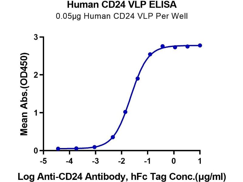 - Immobilized Human CD24 VLP at 0.5 ug/ml (100 ul/Well) on the plate. Dose response curve for Anti-CD24 Antibody, hFc Tag with the EC50 of 3.7 ng/ml determined by ELISA (QC Test).