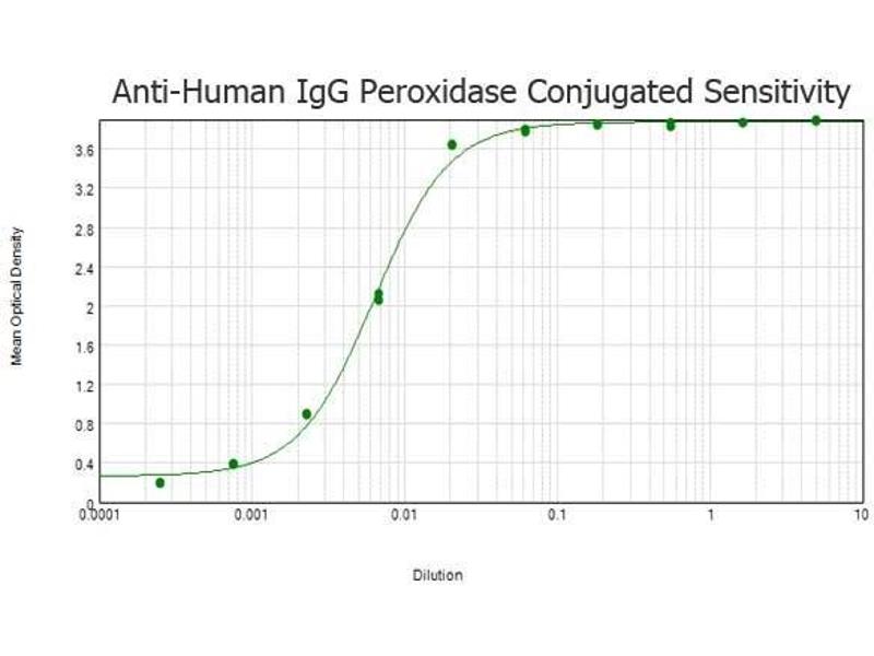 Application Note: Anti-Human IgG (H&L) peroxidase conjugated antibody has been tested by dot blot and ELISA and is suitable for immunoblotting (western or dot blot), ELISA, immunoperoxidase electron microscopy and immunohistochemistry as well as other peroxidase-antibody based enzymatic assays requiring lot-to-lot consistency. Immunohistochemistry Dilution: 1:1,000 - 1:5,000 Western Blot Dilution: 1:5,000 - 1:25,000 ELISA Dilution: 1:20,000 - 1:80,000 Other: User Optimized