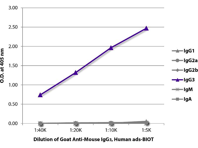 Reacts with the heavy chain of mouse IgG 3 as demonstrated by ELISA and flow cytometry.