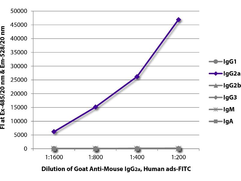 Reacts with the heavy chain of mouse IgG 2a as demonstrated by ELISA and flow cytometry.