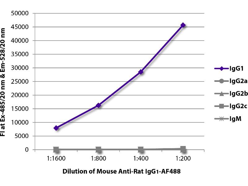Reacts with the gamma 1 heavy chain (Fc) of Rat IgG1,
