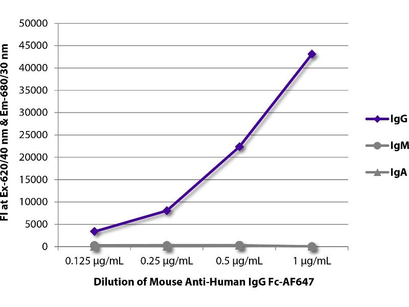 Working Dilutions: ELISA AP conjugate 1:2,000 - 1:8,000 HRP conjugate 1:4,000 - 1:8,000 BIOT conjugate 1:10,000 - 1:20,000 FLISA FITC conjugate 1:200 - 1:600 AF488 and AF555 conjugates 1:100 - 1:400 PE and AF647 conjugates 1 g/mL Flow Cytometry Purified (UNLB) antibody 1 g/106 cells FITC, BIOT, and AF488 conjugates 1 g/106 cells CY5 conjugate 0.3 g/106 cells PE, APC, SPRD, and AF647 conjugates 0.1 g/106 cells For flow cytometry, the suggested use of these reagents is in a final volume of 100 L