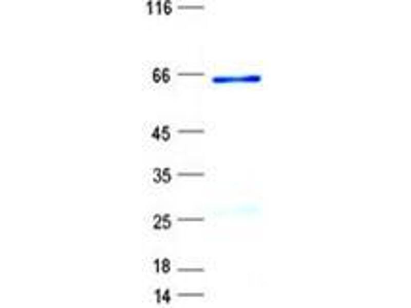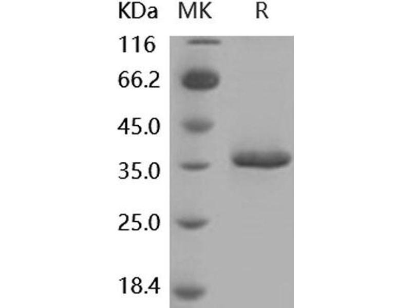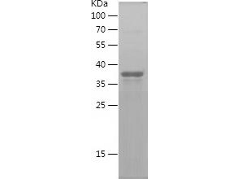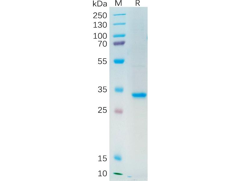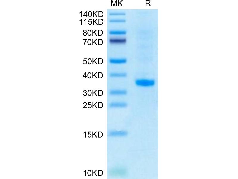 The purity of the protein is greater than 90 % as determined by SDS-PAGE and Coomassie blue staining.