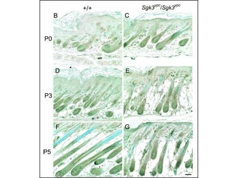 : "The critical roles of serum/glucocorticoid-regulated kinase 3 (SGK3) in the hair follicle morphogenesis and homeostasis: the allelic difference provides novel insights into hair follicle biology." dans: The American journal of pathology, Vol. 168, Issue 4, pp. 1119-33, (2006) (PubMed).