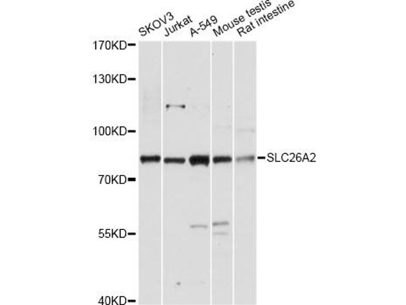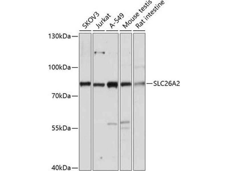 : "Epigenetic silencing of the sulfate transporter gene DTDST induces sialyl Lewisx expression and accelerates proliferation of colon cancer cells." dans: Cancer research, Vol. 70, Issue 10, pp. 4064-73, (2010) (PubMed).Pseudonymes pour SLC26A2 Anticorps
