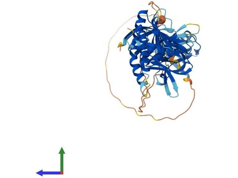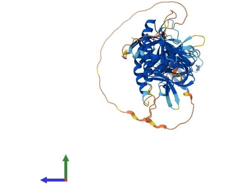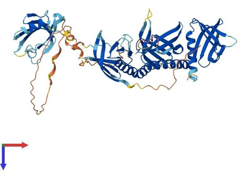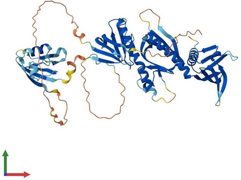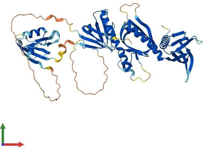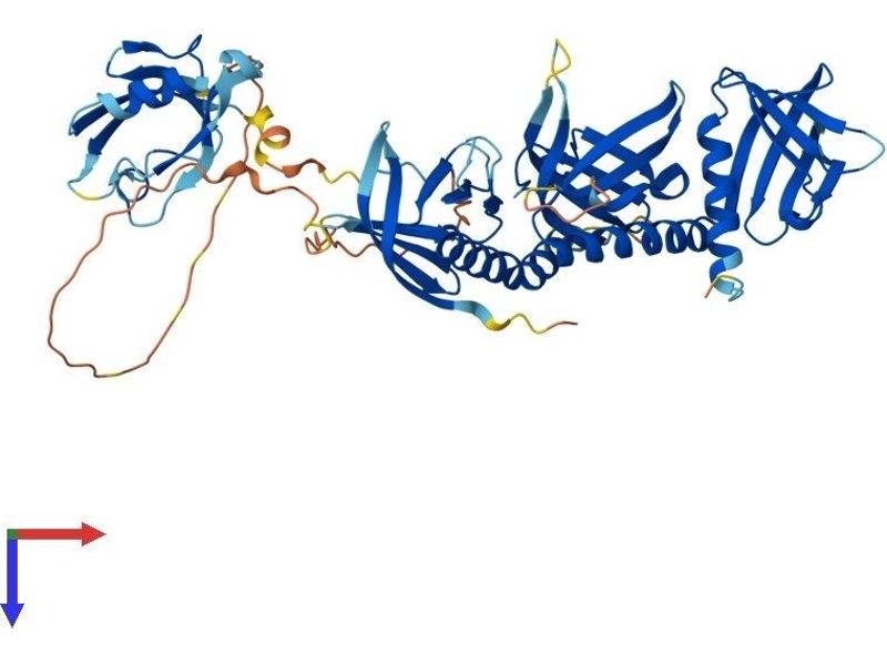 Dystrophin is a large, rod-like cytoskeletal protein found at the inner surface of muscle fibers. Dystrophin is missing in Duchenne Muscular Dystrophy patients and is present in reduced amounts in Becker Muscular Dystrophy patients. The protein encoded by this gene is a peripheral membrane protein found associated with dystrophin and dystrophin-related proteins. This gene is a member of the syntrophin gene family, which contains at least two other structurally-related genes. [provided by RefSeq, Jul 2008].