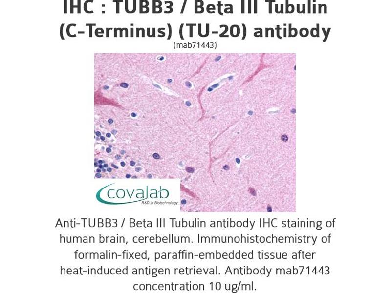 TUBB3 Reactivité: Humain, Souris, Rat, Boeuf (Vache), Porc, Hamster, Babouin WB, IF, IHC (p), IHC (fro) Hôte: Souris Monoclonal TU-20 unconjugated