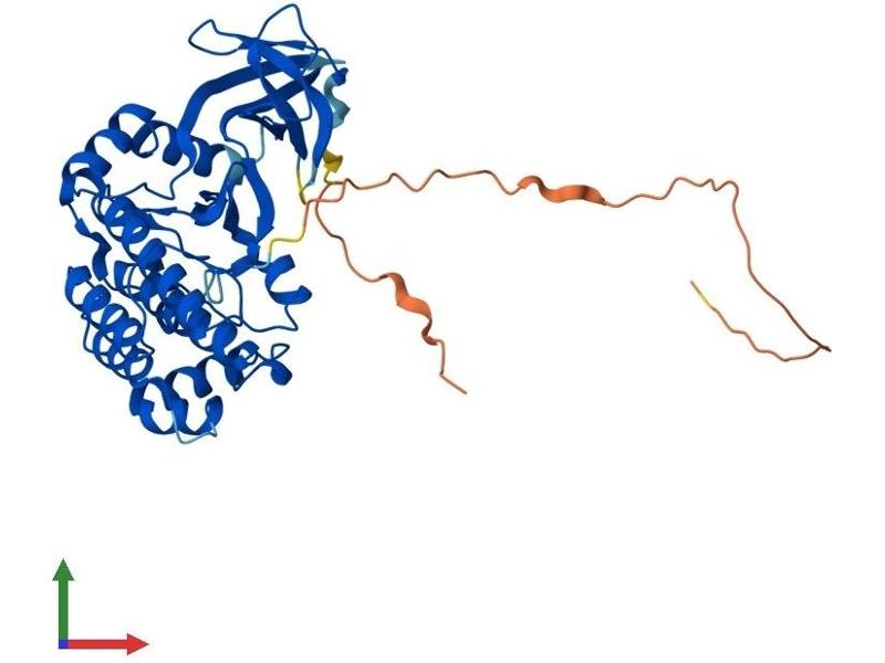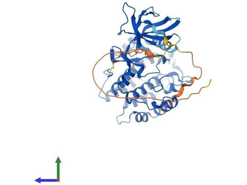 This gene encodes a member of the vaccinia-related kinase (VRK) family of serine/threonine protein kinases. This gene is widely expressed in human tissues and has increased expression in actively dividing cells, such as those in testis, thymus, fetal liver, and carcinomas. Its protein localizes to the nucleus and has been shown to promote the stability and nuclear accumulation of a transcriptionally active p53 molecule and, in vitro, to phosphorylate Thr18 of p53 and reduce p53 ubiquitination. This gene, therefore, may regulate cell proliferation. This protein also phosphorylates histone, casein, and the transcription factors ATF2 (activating transcription factor 2) and c-JUN. [provided by RefSeq, Jul 2008].